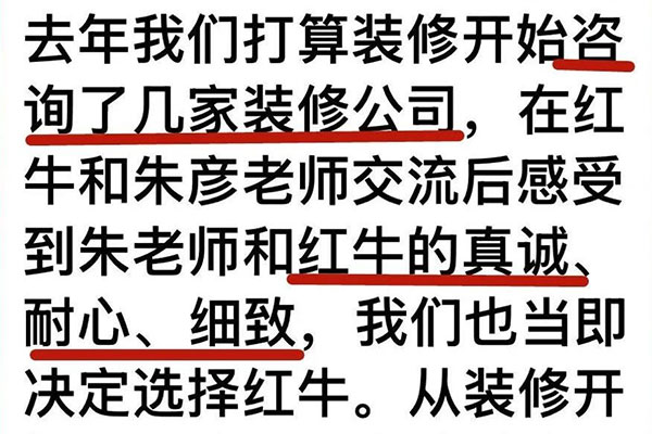 這次找紅牛裝飾公司裝修,也是朋友介紹的。各方面安排比較及時到位,質量控制上也比較好,總體感覺滿意。設計師顧娟工作負責,業(yè)務能力、協(xié)調能力都較強,為這次裝修的滿意完工奠定了基礎!項目經(jīng)理錢新平統(tǒng)籌能力較強,工作負責,安排的水電工、瓦工、木工和油漆工都比較認真負責,手藝也不錯,保證了裝修的施工質量。工程監(jiān)理宋昕業(yè)務精湛,工作認真負責,對裝修施工考慮全面,對質量要求嚴格,經(jīng)常深入工地巡查,發(fā)現(xiàn)問題及時指出,很好地為施工質量把了關。這次找紅牛裝飾公司裝修的體驗是愉快的,謝謝各位!